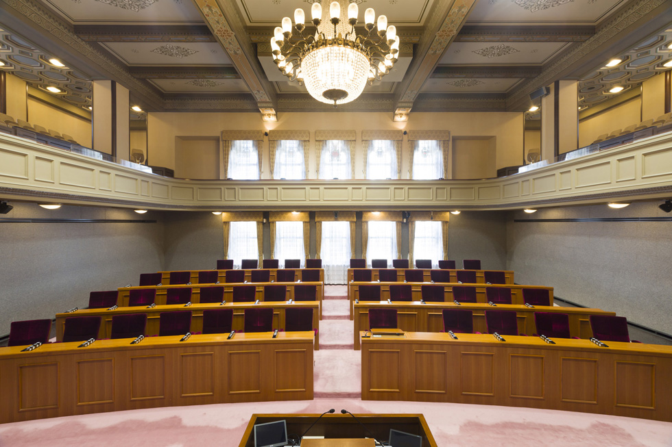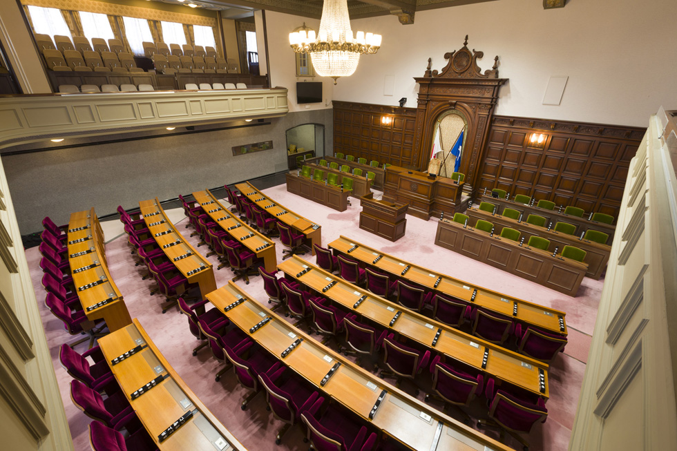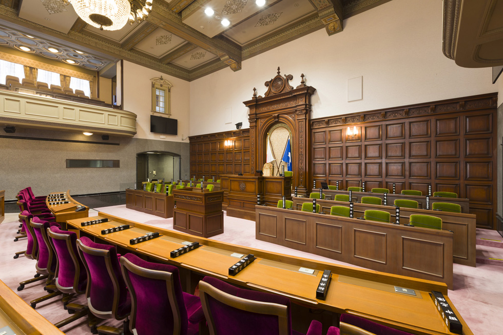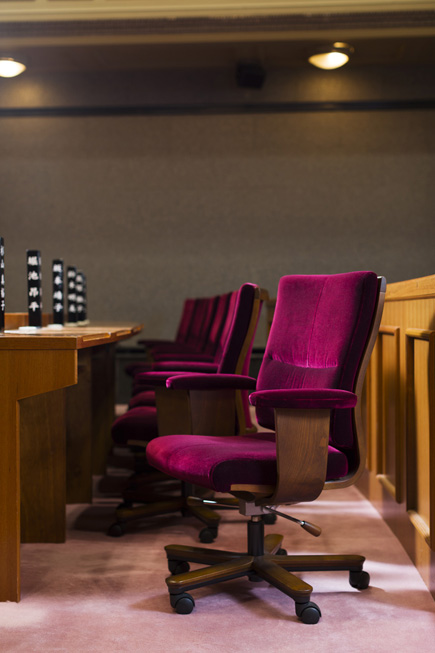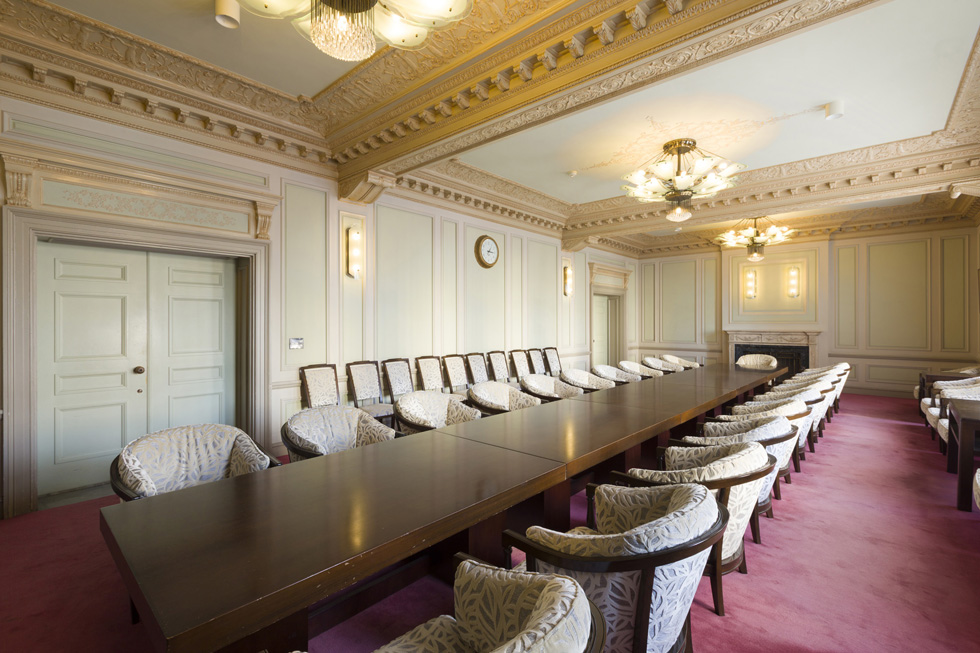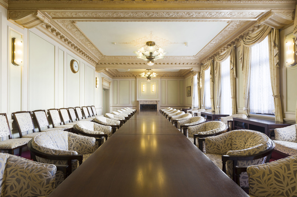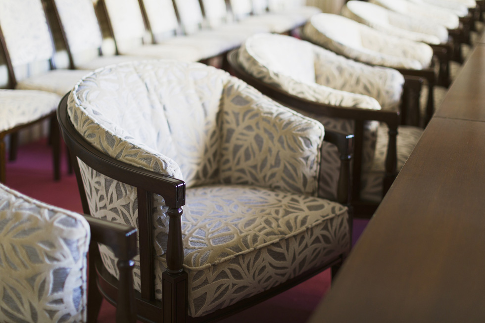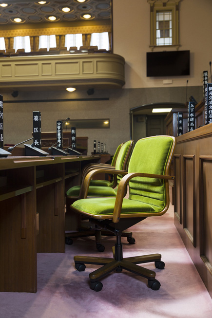 豪華なシャンデリアやステンドグラスが当時の雰囲気を色濃く残す議場には、起毛による独特の光沢が美しい特注張地をまとったカリモク家具のチェア、XT583モデルとXS064モデルが納入されました。