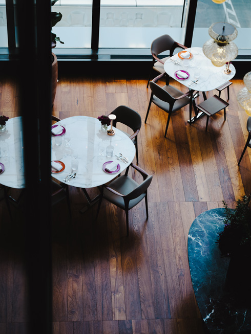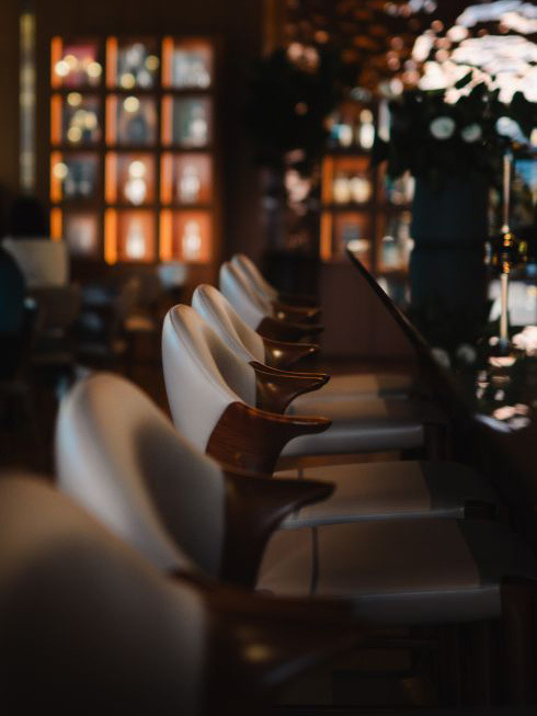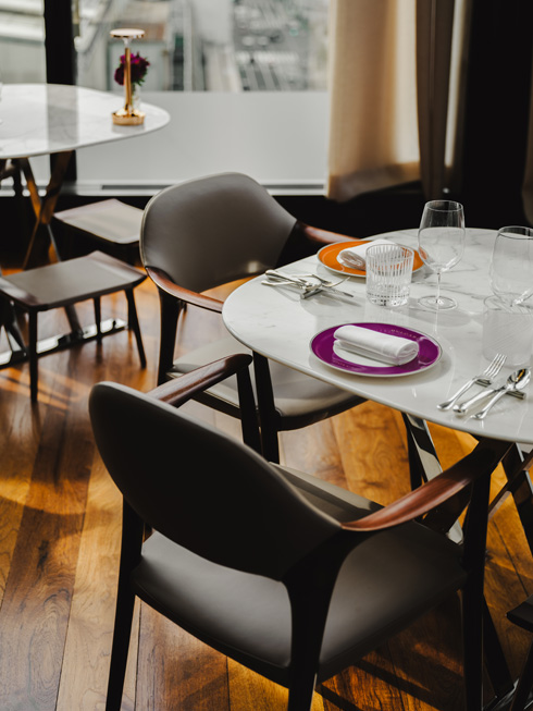 イタリアの洗練と日本の美意識が静かに交差する「BVLGARI TOKYO GINZA BAR & DOLCI (ブルガリ 東京 銀座 バー&ドルチ)」。この空間に、木工技術の粋とモダンデザインが結晶した「KUNST」のチェアが気品ある彩りを添えています。