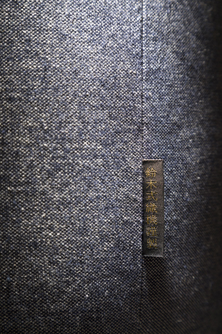 「鈴木式織機謹製」のタグがベンチ側面に配され、歴史の物語を伝えています。創業の精神と技術の継承を象徴するこの張地は、現存する昭和10年代の「鈴木式織機」により、特別に織り上げられたもので、デジタル織機ではない独特の風合いと色味の濃淡を併せ持っています。