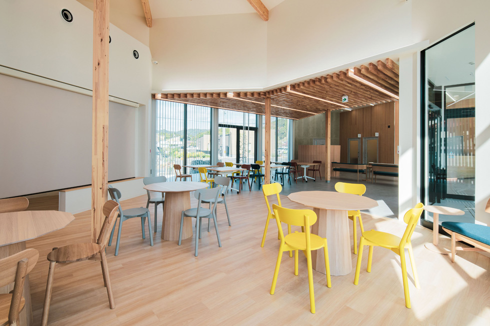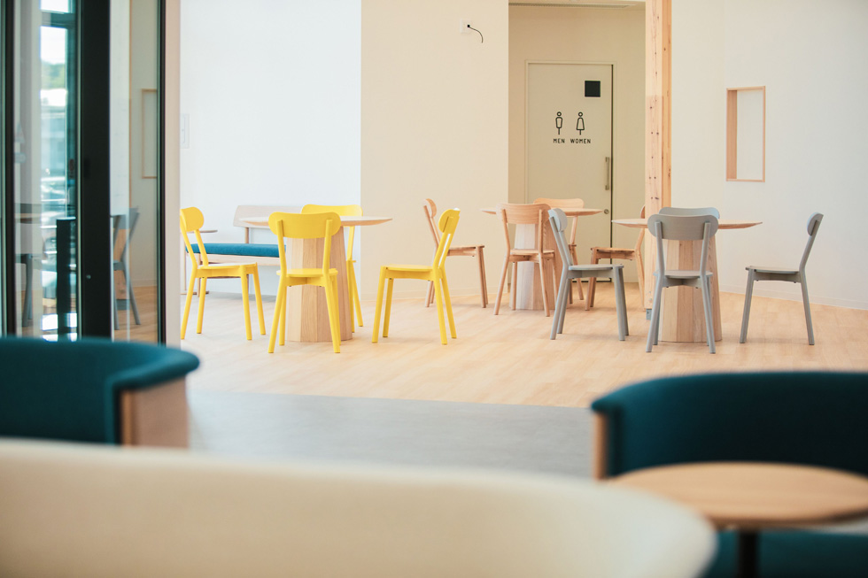 光が降り注ぐ明るい店内において、随所に配された色とりどりの家具は、空間にリズムを与え、視覚的な心地よさを創出しています。多機能なコミュニティスペースとして設置されたテーブルやチェアは、ATM利用後の休息から学生の自習まで、多様な過ごし方に柔軟に応える汎用性を備えています。