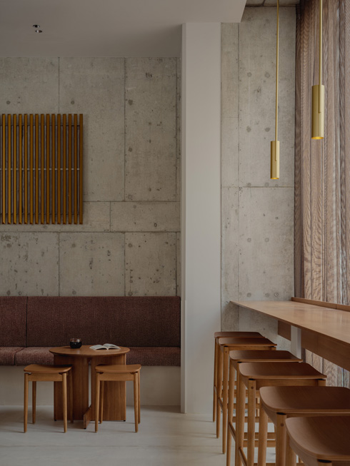 大阪城や通天閣に見られる幾何学的なモチーフを手がかりに、建築がもつブルータリズム的な力強さと、素材がもたらす柔らかさとの調和を追求。木やテキスタイルを組み合わせることで、硬質と温もり、陰影と光、直線と幾何的な面が交錯し、空間全体に穏やかなリズムを生み出しています。「黄金の茶室」や大阪らしい華やかさに着想を得て、照明や家具、アートに加えられたごく控えめなゴールドは、そのささやかな輝きが落ち着いた空間に品のあるアクセントを添えています。